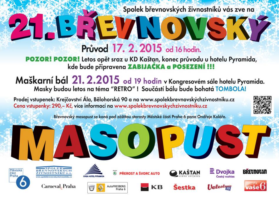 21. Břevnovský masopustní průvod projde Břevnovem v úterý 17.2.2015 a letos stejně jako loni vyjde od KC Kaštan, Bělohorská 150. Sraz masek je v 15.45.
