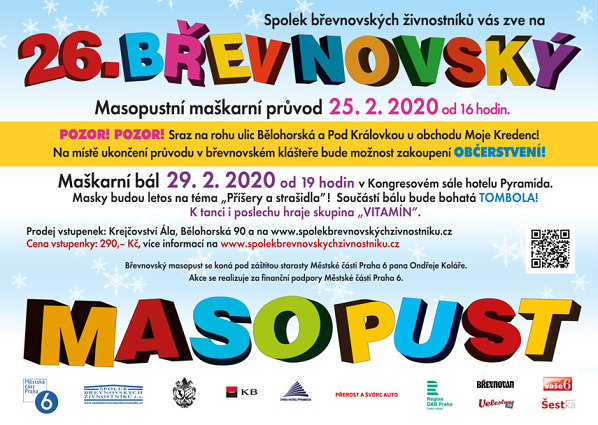 Zveme Vás na tradiční 26. břevnovský masopust, průvod vyrazí Břevnovem v úterý 25. února 2020 a i letos bude vycházet od křižovatky Bělohorská - Pod Královkou (u Kredence). Sraz masek je v 15.45. V 16 hodin bude uděleno masopustní právo zástupcem MČ Praha 6 a průvod se vydá za náležitého veselí masek i ostatních občanů na svoji cestu po Bělohorské až ke KC Kaštan, kde bude pochována basa. Průvod doprovodí bubeníci a další hudebníci. Dorazí i kejklíř Vítek se svojí družinou a dlouhorukými Chudadly a další maškary.