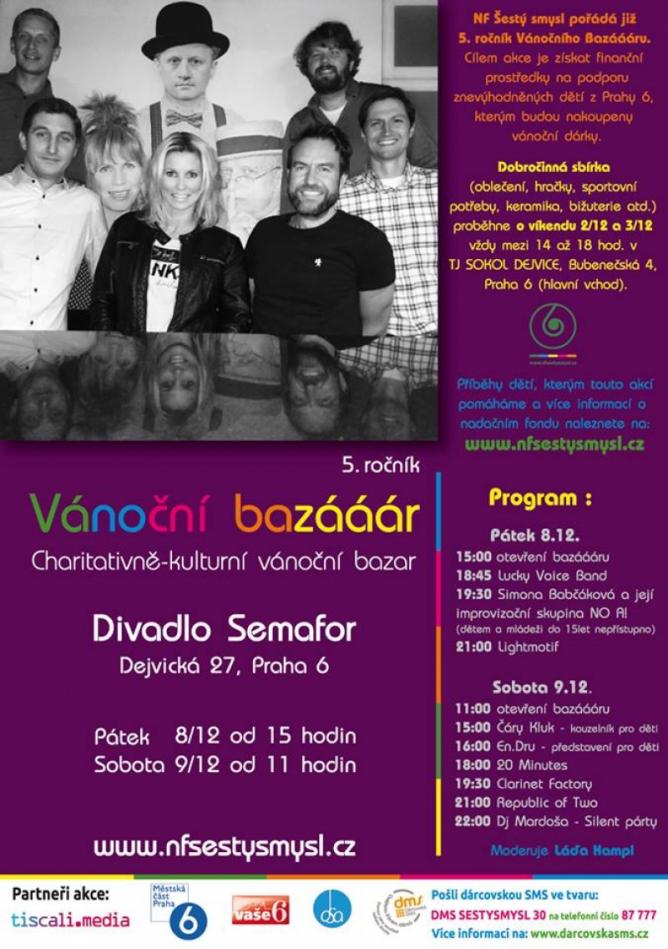Zveme Vás na 5. ročník tradiční charitativně-kulturní akce, kterou pořádá Nadační fond Šestý smysl ve spolupráci s městskou částí Praha 6. VÁNOČNÍ BAZÁÁÁR se letos koná v PÁTEK 8. 12. od 15.00 hodin a v SOBOTU 9. 12. od 11.00 hodin v Divadle SEMAFOR.