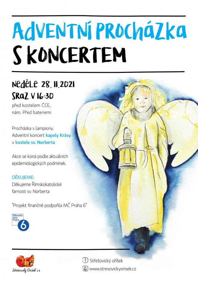 Adventní procházka pro rodiny s dětmi s lampiony - sraz v 16:30 před kostelem ČCE nám Před Bateriemi. Adventní koncert kapely Krásy v kostele sv. Norberta.