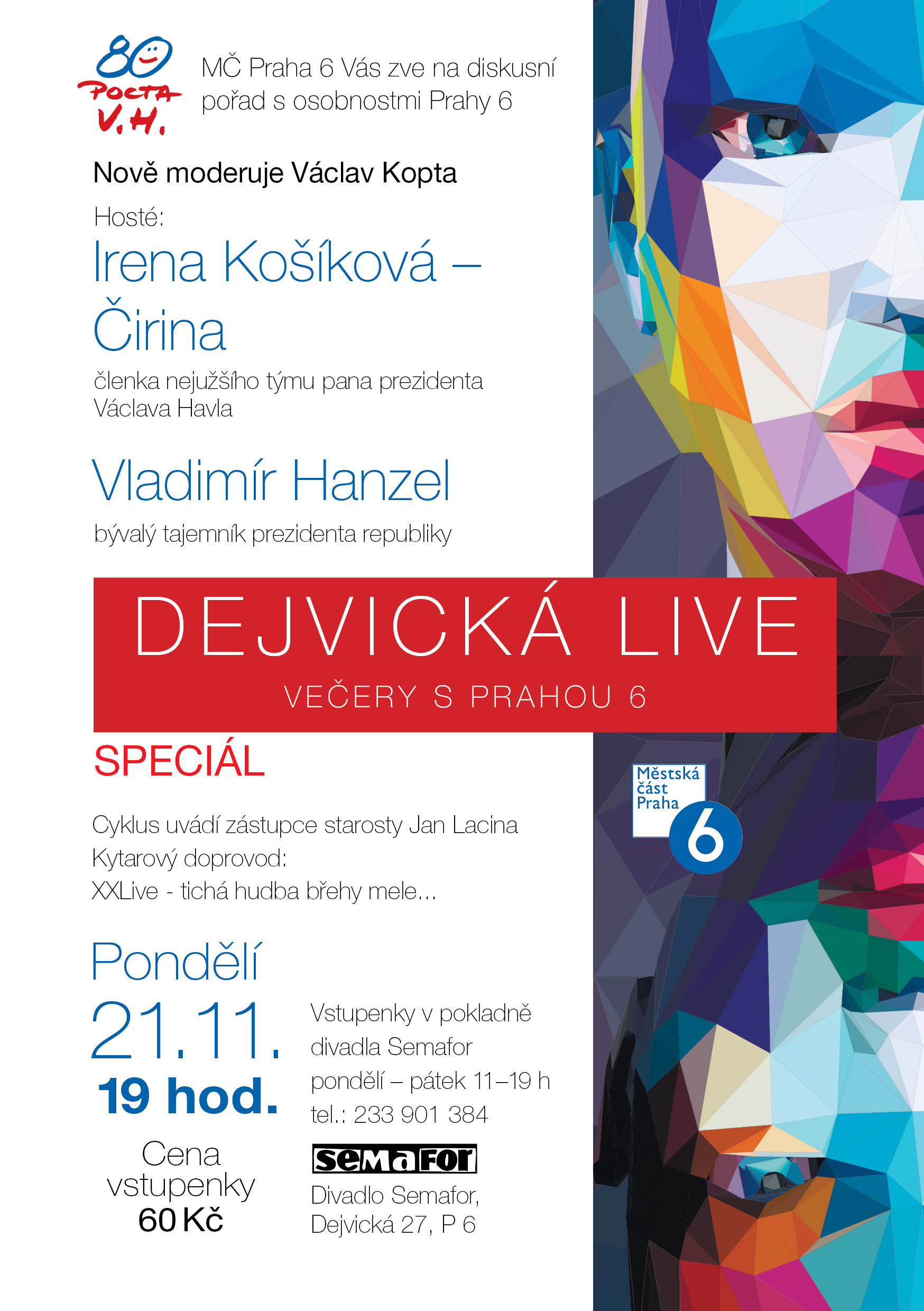 V pondělí 21. 11. se můžete opět těšit na Dejvickou Live, která tento měsíc přináší posezení s Irenou Košíkovou a Vladimírem Hanzelem.