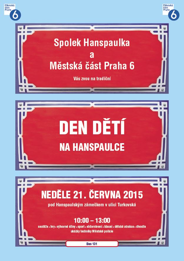 Spolek Hanspaulka a MČ Praha 6 Vás zvou na tradiční Den dětí na Hanspaulce, která se uskuteční v neděli 21. června od 10 do 13 hodin na louce pod Hanspaulským zámečkem v ulici Turkovská.