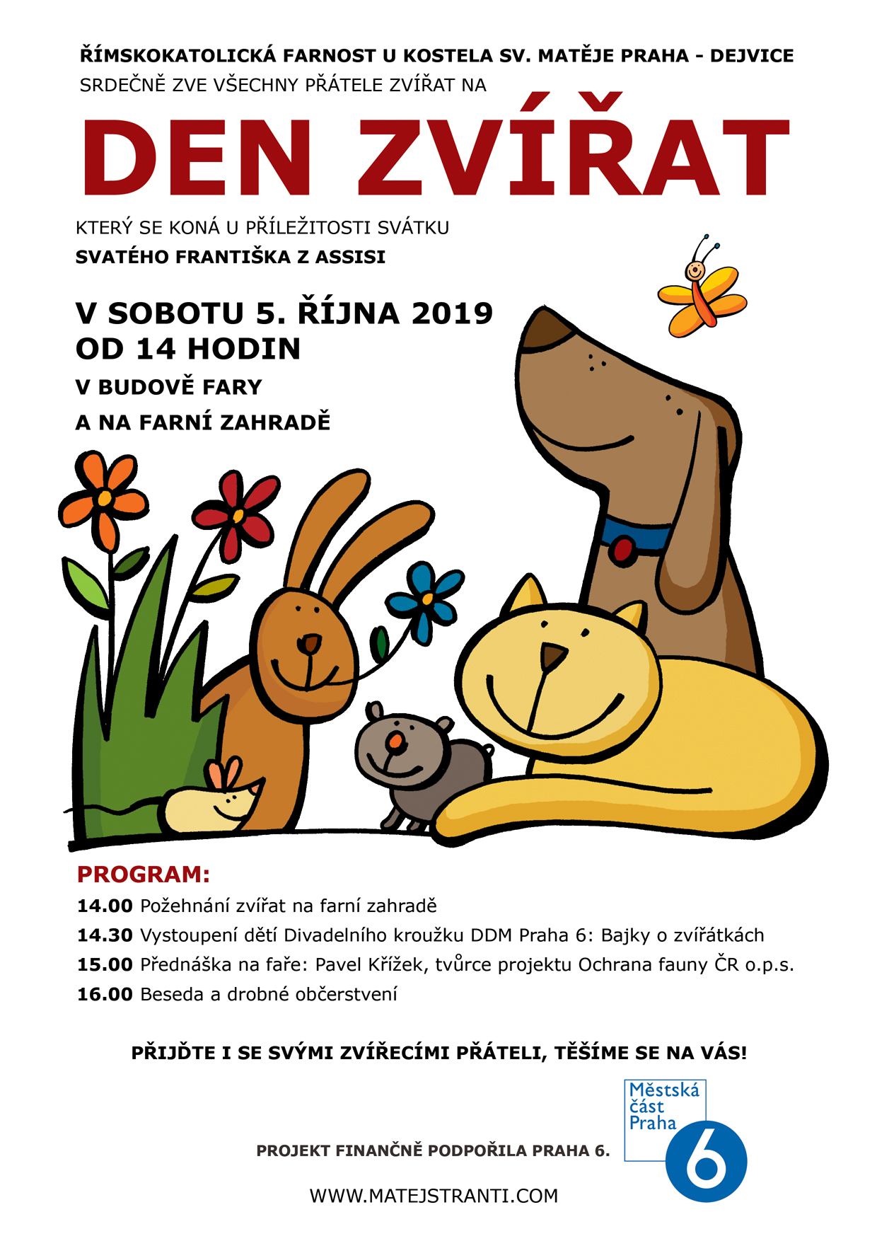 Akce pro milovníky zvířat spojená s duchovním obřadem, dětským divadlem, přednáškou, besedou a drobným pohoštěním. Přijďte i se svými zvířátky!