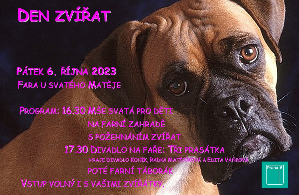 Srdečně zveme na mši s požehnáním zvířatům, která se bude konat na faře u sv. Matěje v Praze - Dejvicích. Vstup volný i s vašimi zvířátky.