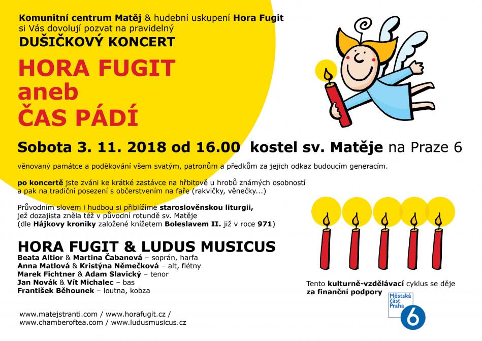 Farnost sv. Matěje srdečně zve na "Dušičkový" koncert v kostele sv. Matěje. Jeho název je Hora fugit - aneb čas pádí a zazní u příležitosti svátků Všech svatých a Vzpomínky všech věrných zemřelých.