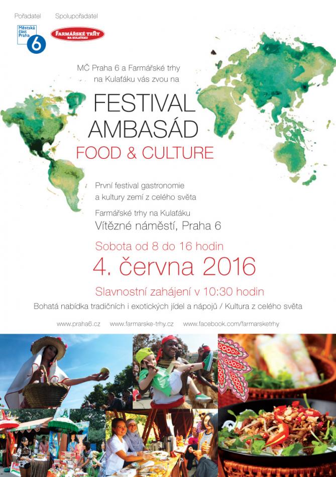 Městská část Praha 6 srdečně zve na první festival gastronomie a kultury zemí z celého světa, který se uskuteční v sobotu 4. června 2016 od 8 do 16 hodin v rámci Farmářský trhů na Kulaťáku největší mezinárodní prezentace chutí a kultury FESTIVAL AMBASÁD FOOD AND CULTURE.
