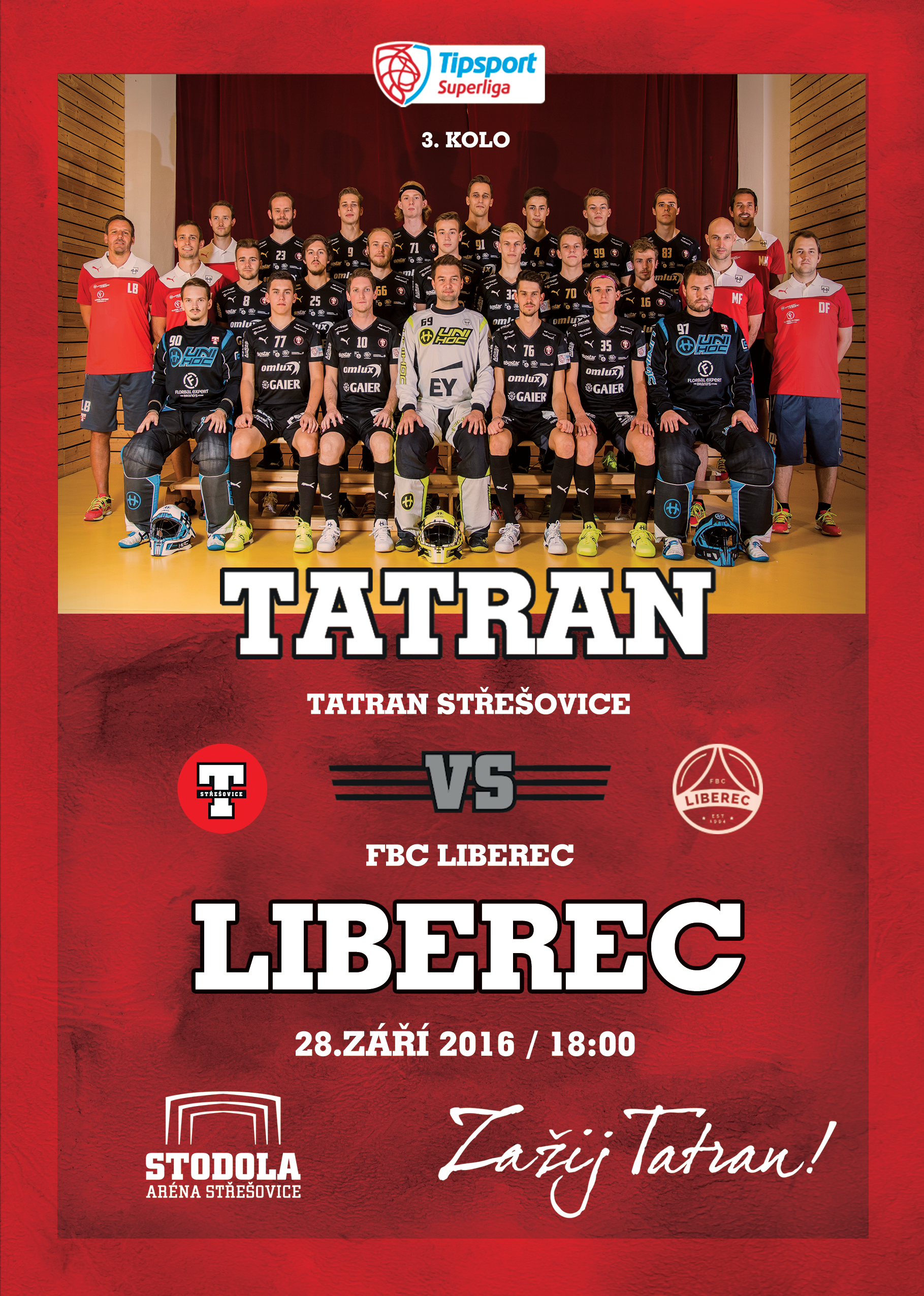 16-ti násobný Mistr ČR Tatran Střešovice hostí ve 3.kole florbalové superligy nováčka z Liberce. Letos poprvé ve STODOLA ARÉNA Střešovice uvidíte prozatím neporažené medailisty z CZECH OPEN 2016, domácí střešovické hráče. Přijďte na florbalové odpoledne do Střešovic, které odstartuje ve 13,30 hod turnaj dětí (6-11 let). Zasoutěžte si o florbalové ceny, shlédněte vystoupení Chilli Cheerleaders.