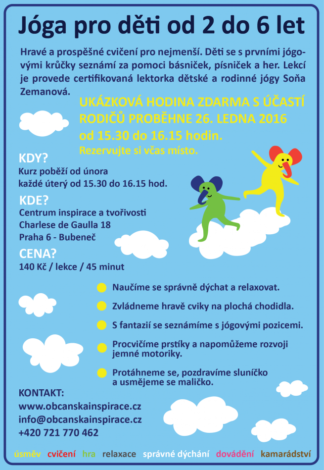 Pozvánka na ukázkovou hodinu jógy pro děti ( od 2 - 6 let ) 26.1. 15.30 - 16.15 v Centru inspirace a tvořivosti.