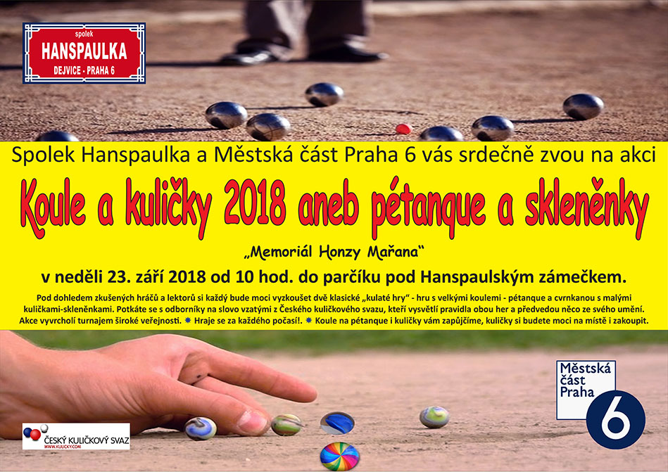 Spolek Hanspaulka a Městská část Praha 6 srdečně zvou na akci „Koule a kuličky 2018 aneb pétanque a skleněnky“. V neděli 23. října 2018 od 10 hod. bude parčík pod Hanspaulským zámečkem dočasnou mekkou všech zájemců o tyto velmi staré sporty. Akce nese podtitul „Memoriál Honzy Mařana“ na památku významného členu spolku, který celou akci vymyslel…