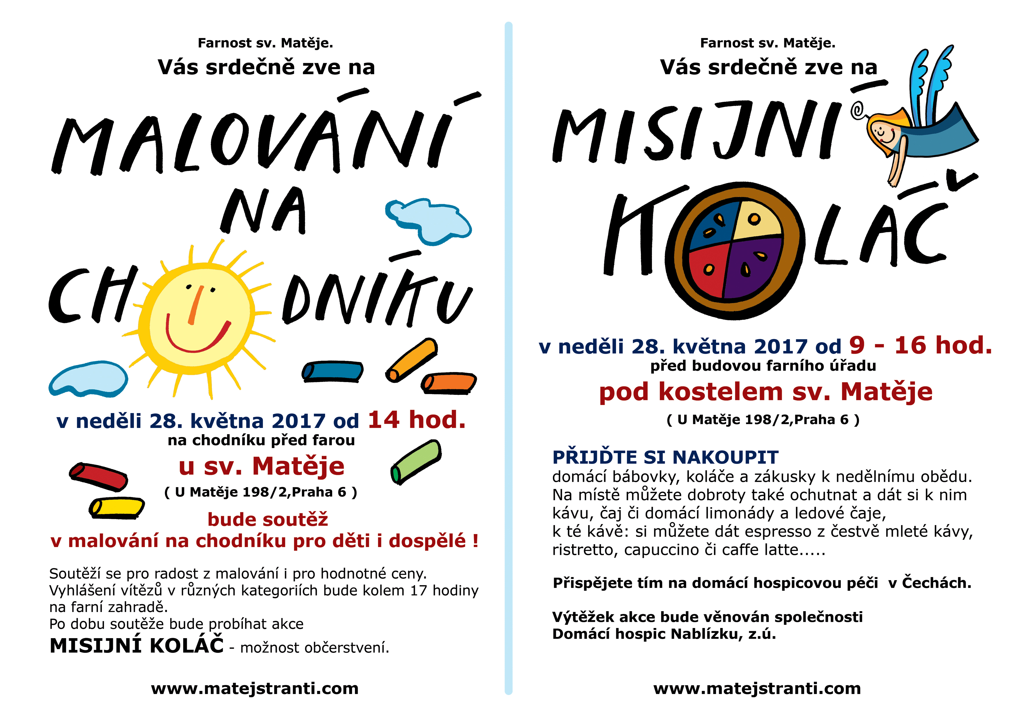 Na chodníku před farou sv. Matěje se bude tradičně soutěžit v malování. Soutěž o ceny je určena dětem i dospělým. Vyhlášení vítězů v různých kategoriích bude kolem 17 hod. Občerstvení u stánku "misijní koláč" (už od rána), kde si můžete koupit domácí koláče, bábovky a dorty k nedělnímu obědu či svačině nebo je ochutnat na místě, dále různé druhy čerstvě mleté kávy, čaje a domácí limonády. Možnost posezení. Výtěžek akce bude věnován české hospicové péči - domácí hospic Nablízku z.ú.