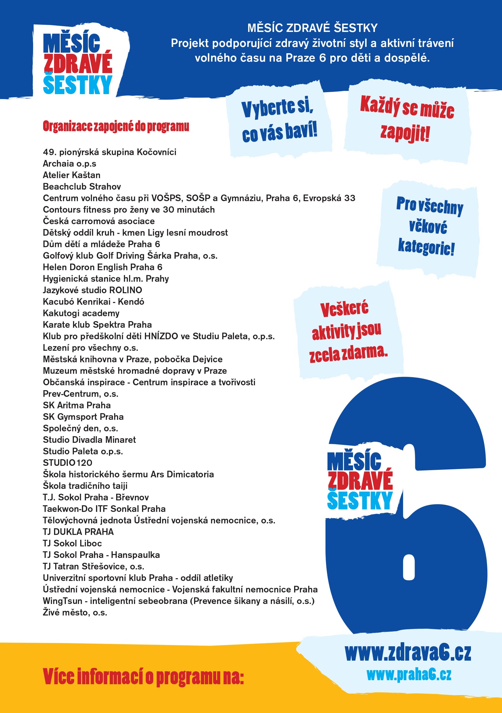 Přehlídka volnočasových aktivit pro všechny věkové kategorie na území Prahy 6 přímo v sídlech organizací.