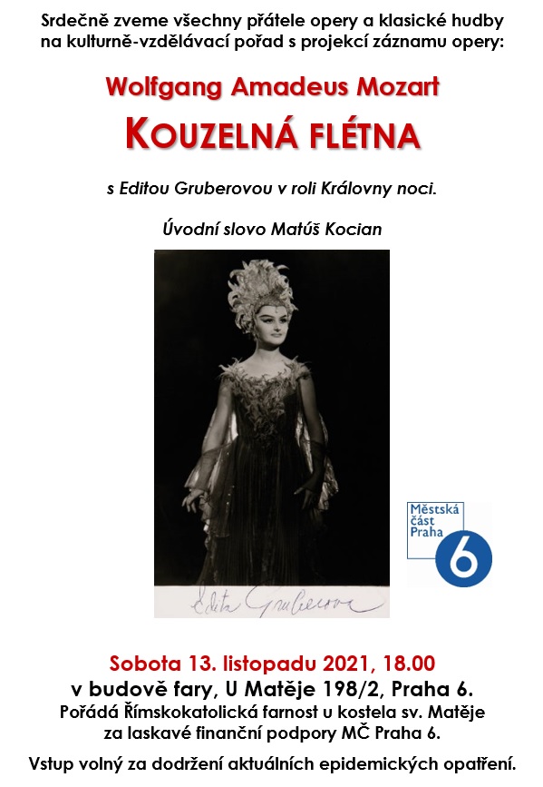 Milí příznivci opery, srdečně vás zveme na další operní večer na faře, který se bude konat v sobotu 13.11. od 18.00. Tentokrát aktuálně zařazujeme záznam opery W. A. Mozarta Kouzelná flétna ze Salcburského festivalu z roku 1982, k nedávnému úmrtí proslulé slovenské pěvkyně Edity Gruberové. Vstup volný.