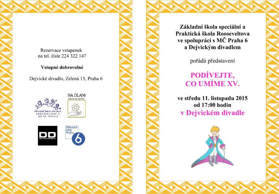 ZŠ speciální a Praktická škola Rooseveltova a spolek Na dlani ve spolupráci s MČ Praha 6 a Dejvickým divadlem Vás srdečně zvou na představení
