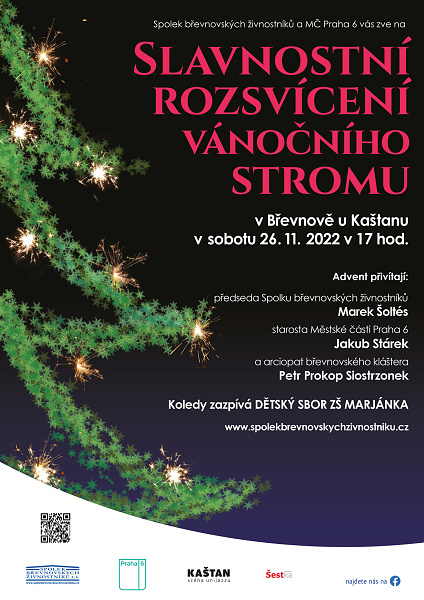 v Bělohorské ulici u Kaštanu. Rozsvícení 26. 11. 2022 v 17:00 hod., občerstvení již od 16:00. Koledy zazpívá pěvecký sbor ZŠ Marjánka.