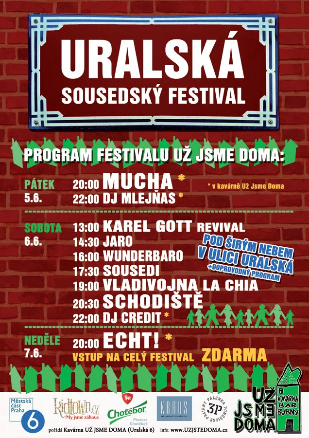 Tak by se dal charakterizovat víkendový festival, který za finančního přispění MČ Praha 6 proběhne v kavárně Už jsme doma a také pod širým nebem v ulicích Prahy 6, v prostoru Uralská a Puškinovo náměstí.