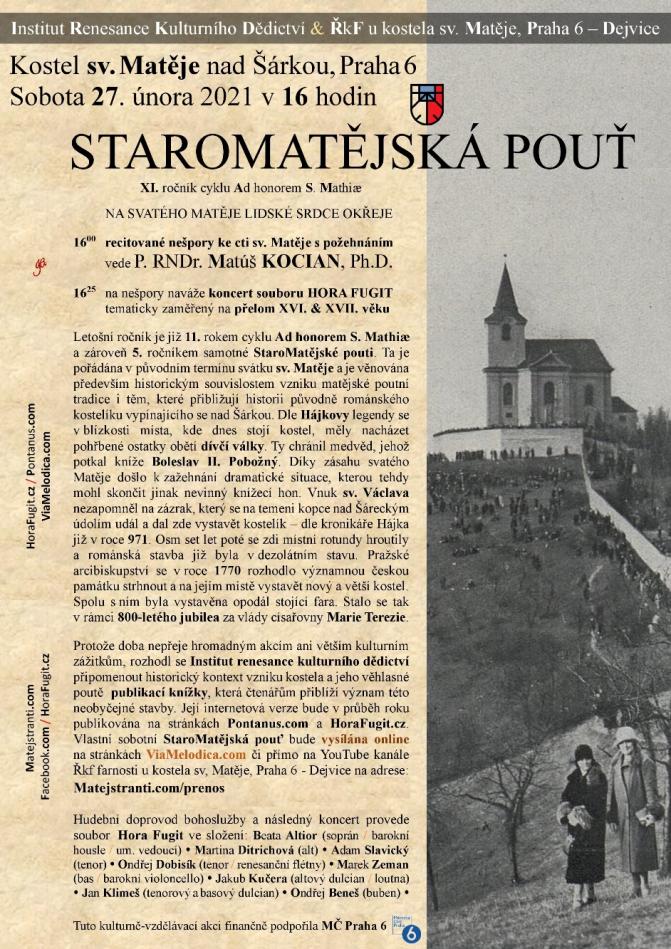 Již pátý ročník tradiční StaroMatějské pouti se uskuteční v sobotu 27.2. v kostele sv. Matěje. Od 16h se konají nešpory vedené P. Matúšem Kocianem, od 16:25 následuje koncert dobové hudby souboru Hora Fugit. Z důvodu aktuálních nařízení se koncert koná online na adrese http://matejstranti.com/prenos - kdokoli se tak může připojit a absolvovat tak letošní pouť k svatému Matěji alespoň virtuálně. Těšíme se na vás!
