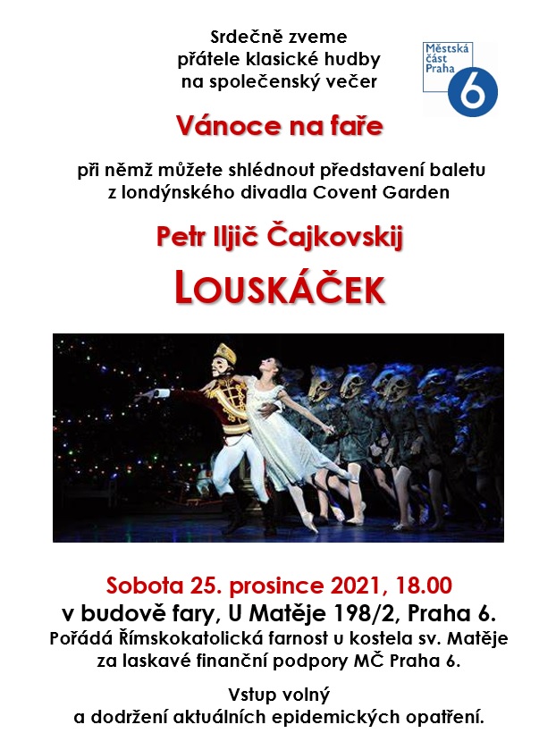 Srdečně zveme na společenský večer Vánoce na faře, při němž shlédneme představení slavného baletu P. I. Čajkovského Louskáček z londýnské královské opery Covent Garden. Vstup volný za dodržení aktuálních epidemických opatření.