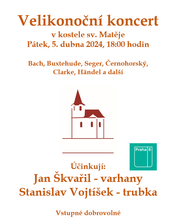 Velikonoční koncert v kostele sv. Matěje, pátek 5. dubna 2024 od 18 hodin. Účinkují Jan Škvařil – varhany a Stanislav Vojtíšek – trubka. Vstupné dobrovolné.