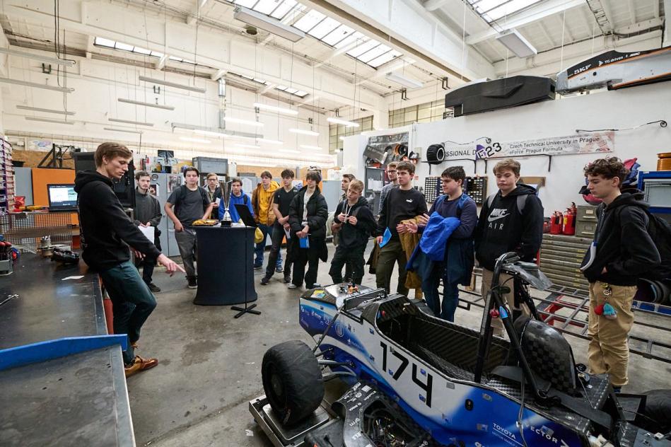 Fakulta elektrotechnická: Prohlídka bezodrazové akustické komory, návštěva dílny eForce s autonomní elektroformulí, multimediální technologie v AV studiu.