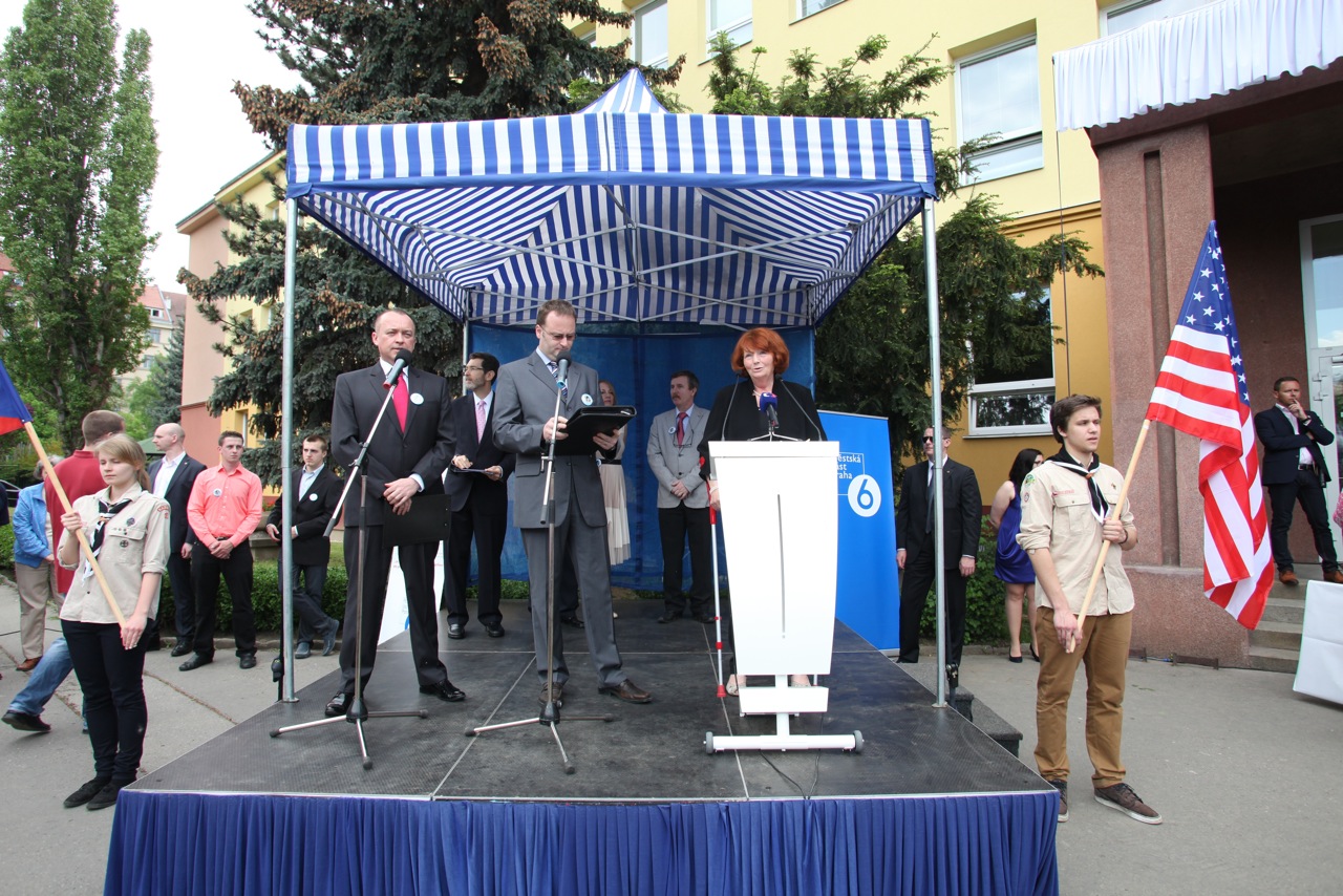 Na fotografii zleva: Ondřej Balatka, radní Prahy 6 pro školství; Petr Karvánek, ředitel školy; Norman L. Eisen, velvyslanec USA v ČR; Anton Kerner, vnuk A. Čermáka a Marie Kousalíková, starostka městské části Praha 6.