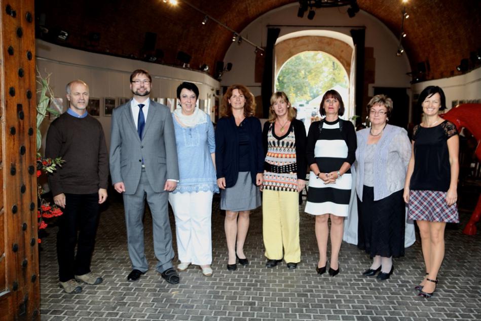 Ocenění učitelé na společné fotografii. Zleva: Petr Blažka, Ondřej Balatka, radní Prahy 6, Hana Chmelařová, Jana Vavrlová, Irena Přibylová, Hana Hůlková, Marie Ferechová, Markéta Kratochvílová